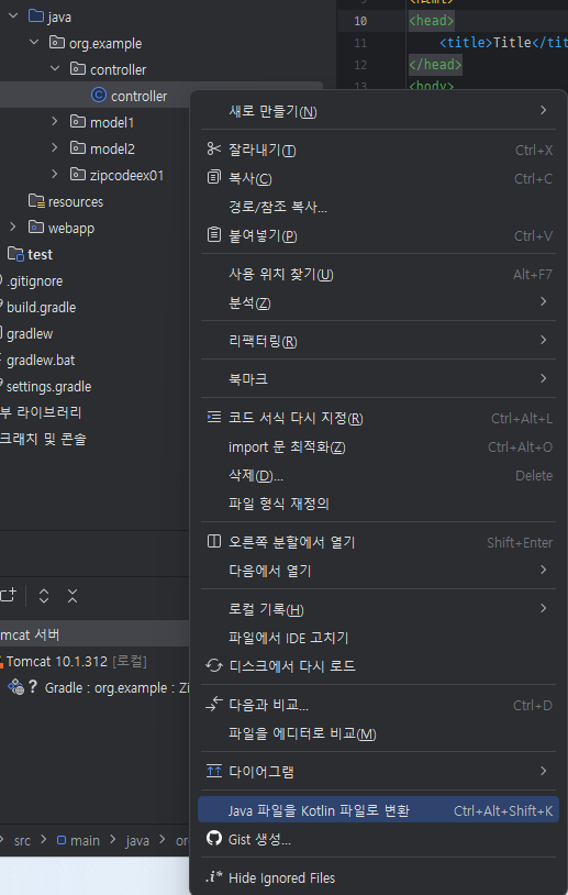 변환을 원하고자 하는 파일을 우클릭하면 위와같이 Java 파일을 Kotlin 파일로 변환이 뜨는데 이 기능을 활용하면 된다
